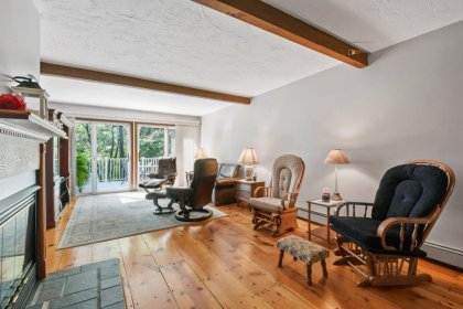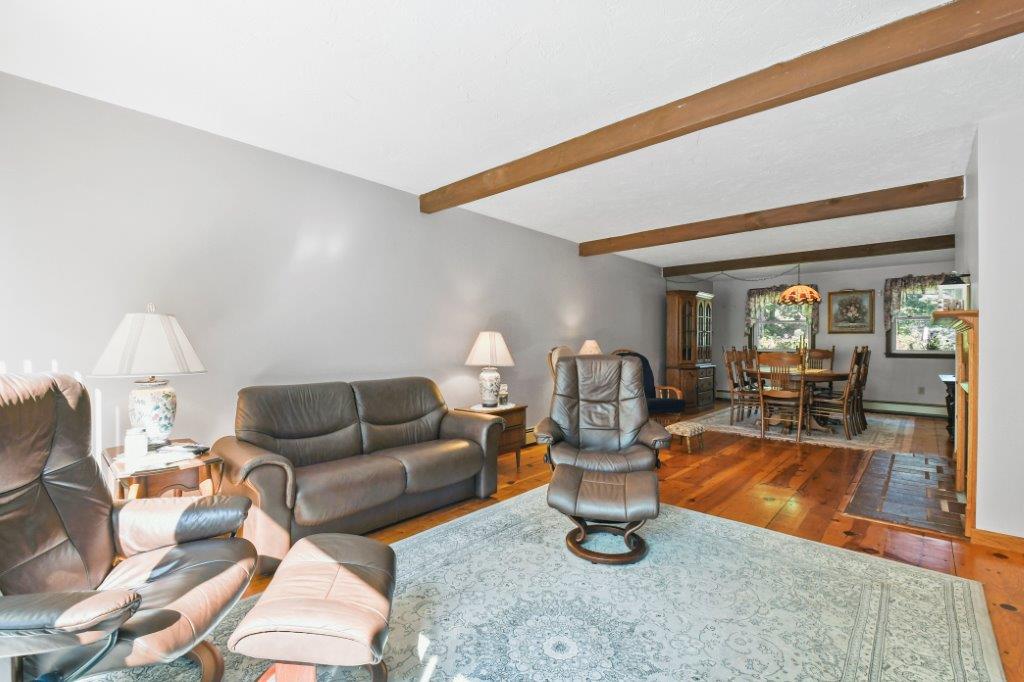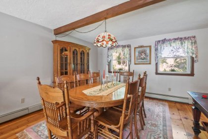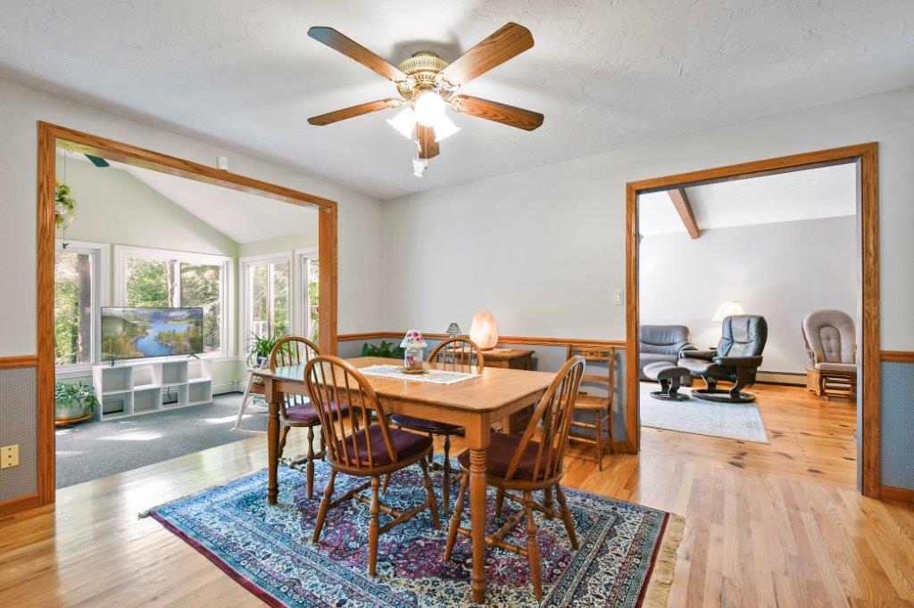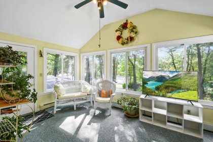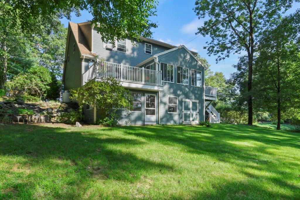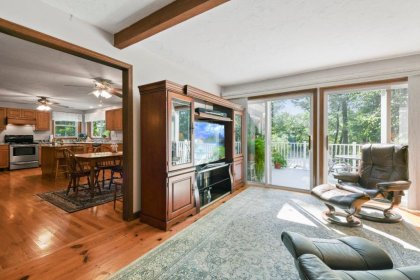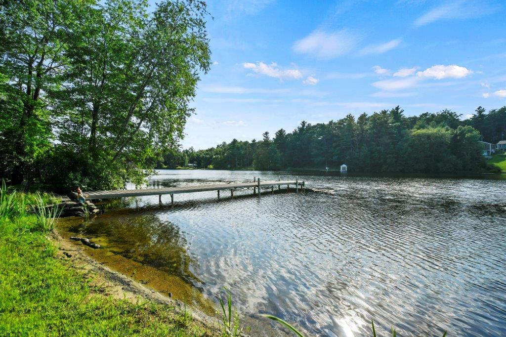 Discover tranquility at this charming Cape nestled along the serene shores of Baker Pond & embrace the beauty of waterfront living. Enter to find an inviting fireplaced living room adorned with rustic beamed ceilings, gleaming HW floors, & sliders that open to the back deck, connecting indoor & outdoor spaces. The main level unfolds into a formal dining room, seamlessly connected to the living area, perfect for gatherings and entertaining. An eat-in kitchen beckons with its HW floors, complete w/ an island boasting a breakfast bar, S/S appliances, & granite countertops & a sunroom invites to enjoy nature year-round! A convenient 1st floor bedroom completes the main level. Ascend to 2nd level, where 3 good-sized bedrooms await. The finished lower level unveils an inviting bonus room & storage rm. The expansive yard guides you to the water's edge, where a private dock awaits, beckoning for leisurely afternoons of boating & contemplation. Attached garage and plenty of off street parking!