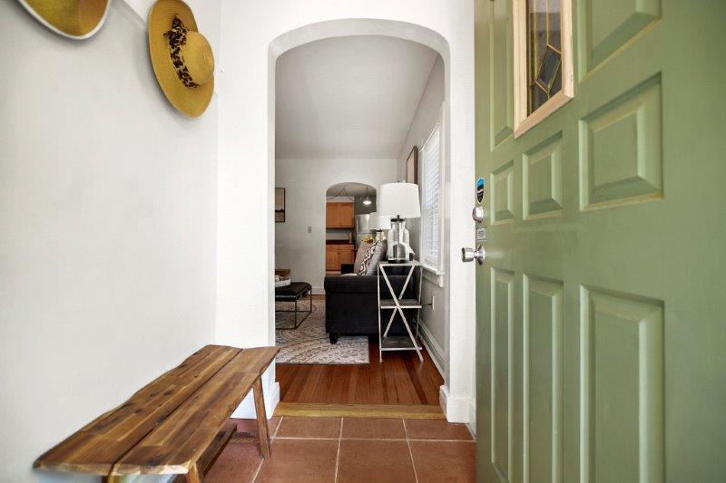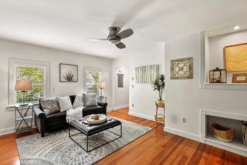 floors in the living room. The spacious living room features a cozy nook with built in shelves and lots of natural sunlight. An arched doorway adds character to the nicely