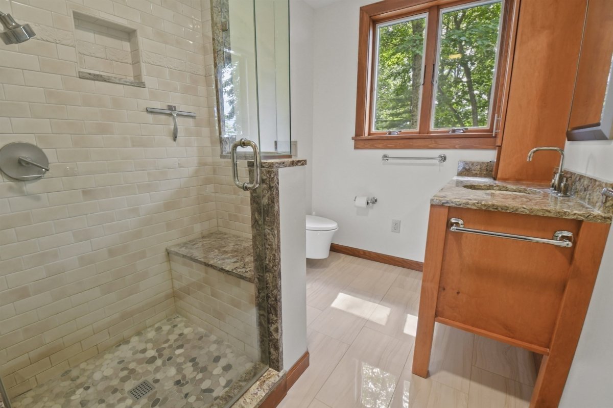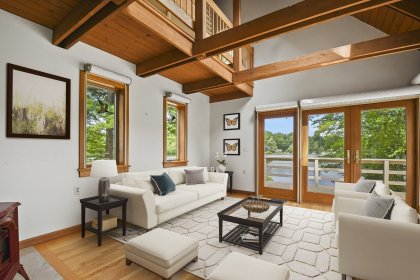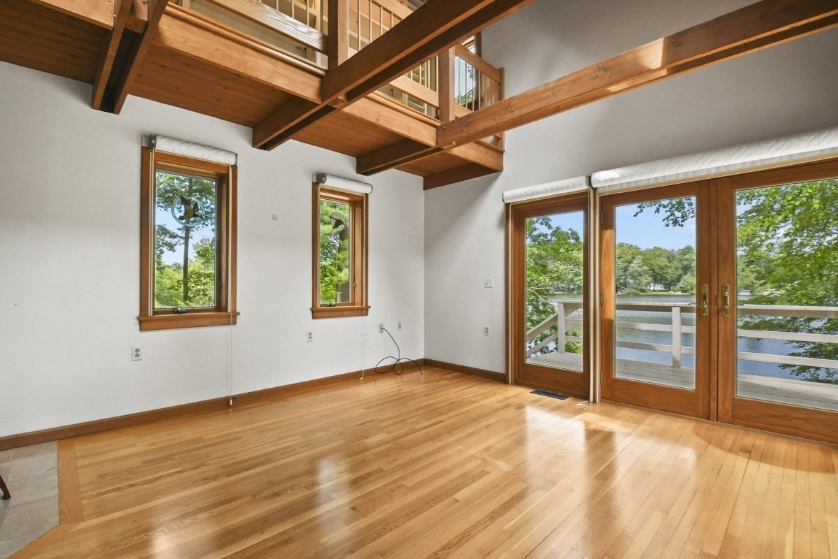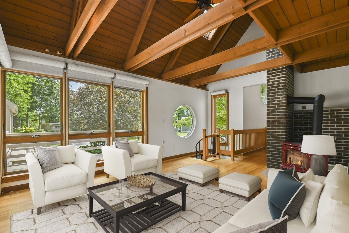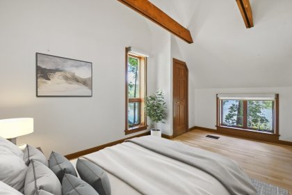 Welcome to your lakefront sanctuary. Discover the perfect blend of luxury and functionality in this stunning contemporary, with detached studio, wellness space w/sauna and lap pool and 2 car garage. The main house has unique Architectural Features such as skylights, striking wood beams, and expansive porthole windows that flood the space with natural light and offer breathtaking views of the lake. Enjoy the elegance and warmth of hardwood flooring which seamlessly connects each space in this beautifully crafted home. Find your escape in the cozy library loft, perfect for a quiet read or a moment of reflection. Ample spaces for relaxation, providing the ideal backdrop for entertaining guests or enjoying peaceful solitude. Detached Building Features: Versatile Upper Level: A spacious room w/ built-ins and skylights, ready to become your dream artist’s studio, game room, or creative haven. Enjoy 200' of your own lake frontage.