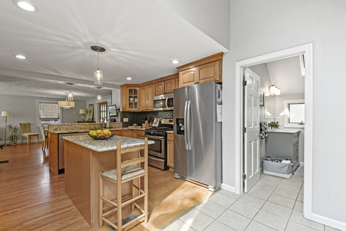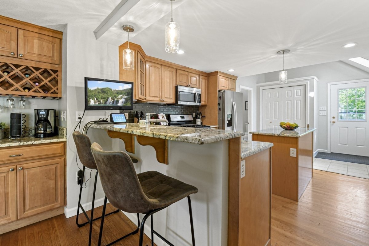 Welcome to this charming Cape-style home in Chelmsford! This sun-drenched gem boasts a welcoming living room with a cozy fireplace and gleaming hardwood floors that flow seamlessly throughout the open floor plan. The cabinet-packed kitchen features stainless steel appliances, stunning granite countertops, and a breakfast bar that opens to a spacious dining area—ideal for entertaining and gatherings. The first-floor bedroom offers convenience, while a full bath off the kitchen, complete with a skylight, adds a touch of elegance. Enjoy relaxation in the generous family room, which overlooks the serene backyard. Upstairs, you'll find two generously sized bedrooms and an additional full bath, providing ample space for everyone. The lower level features a versatile bonus room, perfect for a home office, playroom, or media center. Don’t miss the opportunity to make this well-maintained home your own!