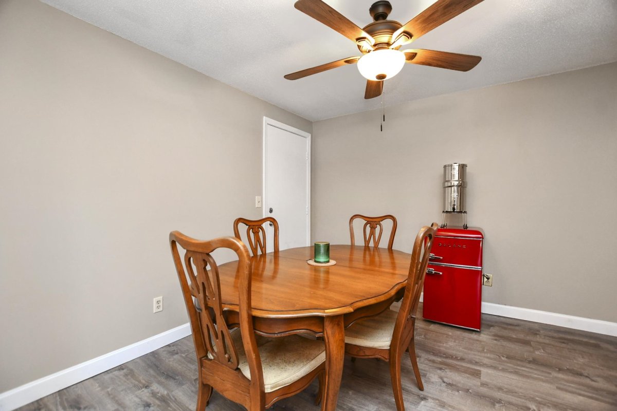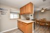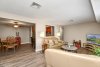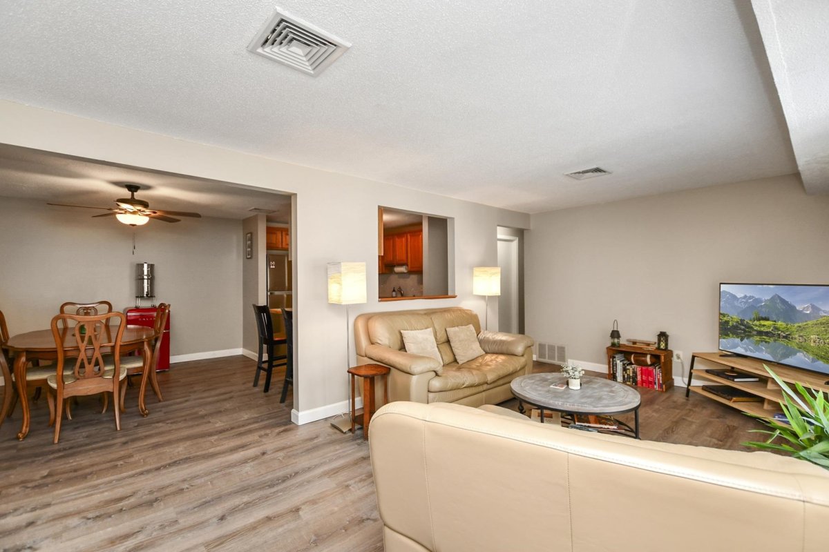 The inviting living room seamlessly flows into a formal dining room, perfect for entertaining. The kitchen is equipped with breakfast bar seating and stainless steel