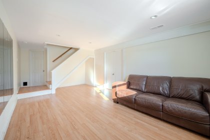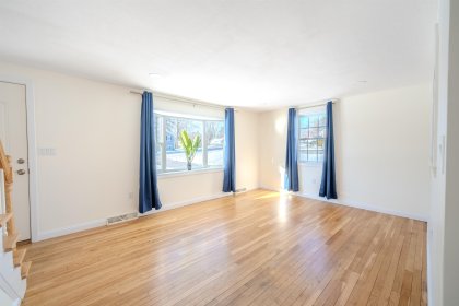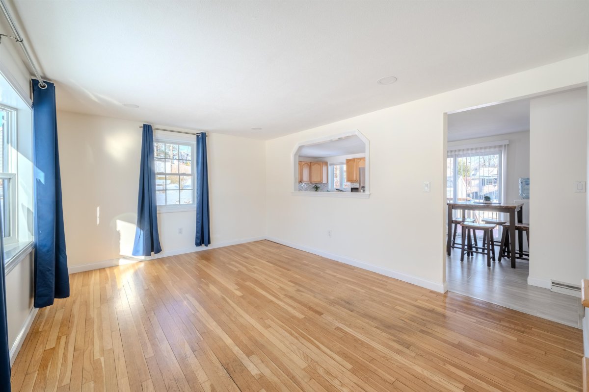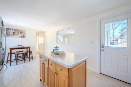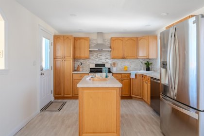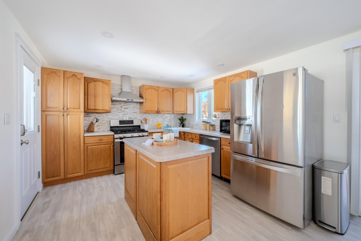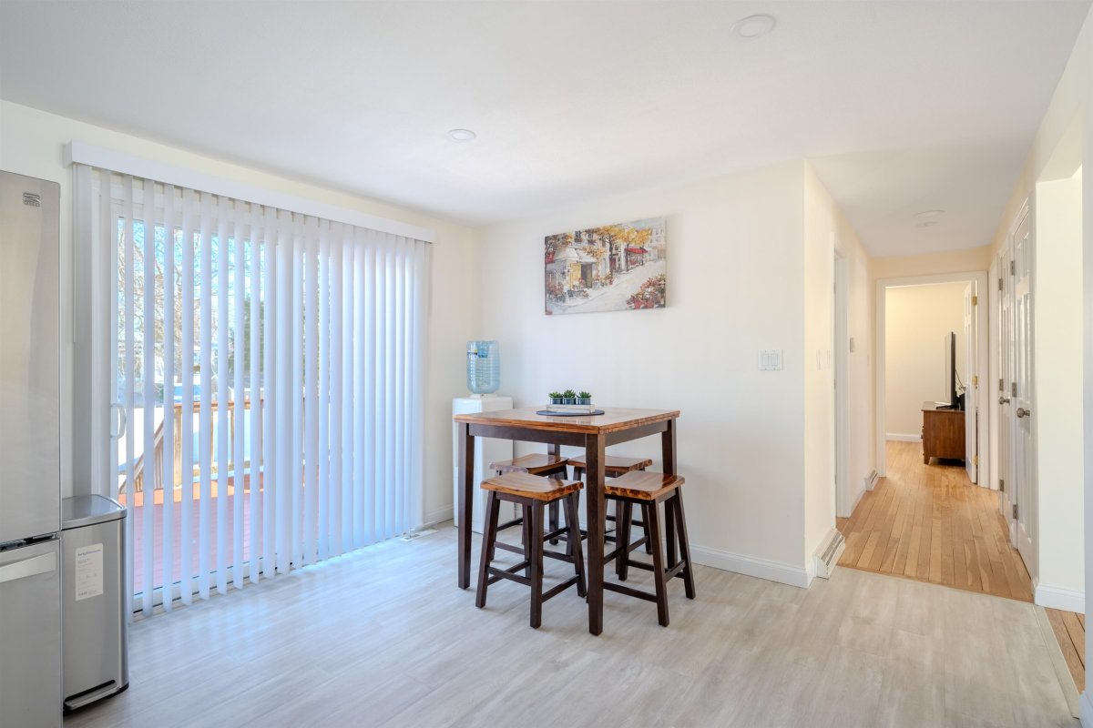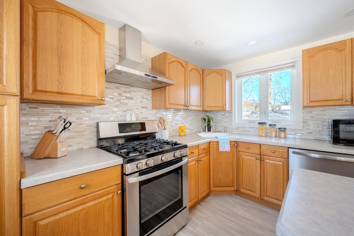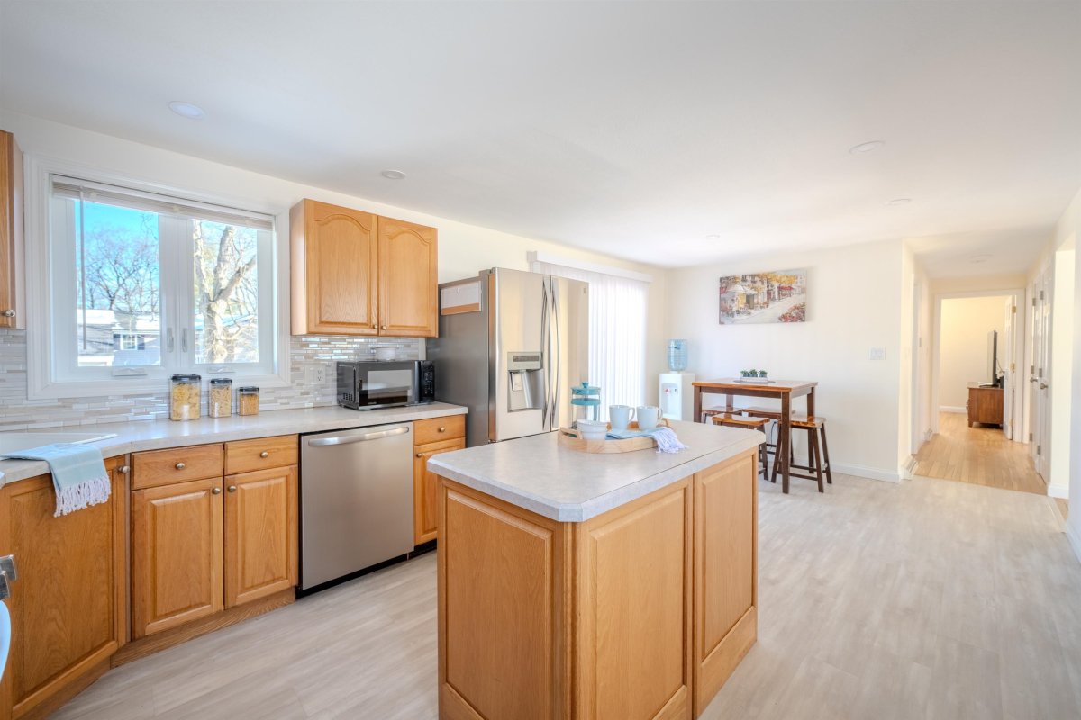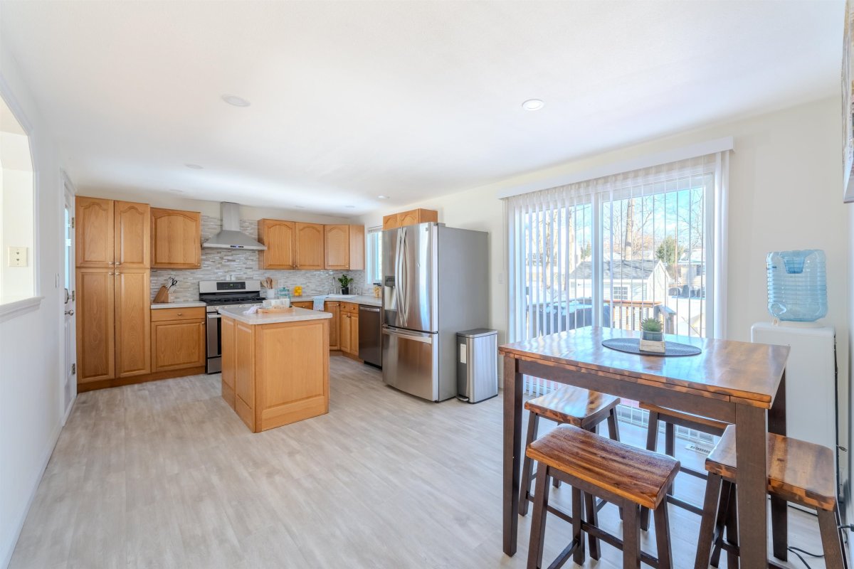 backsplash, island, & laminate flooring. The dining area w/direct access to the deck overlooks the fully fenced yard. The spacious living room features HW floors & bay