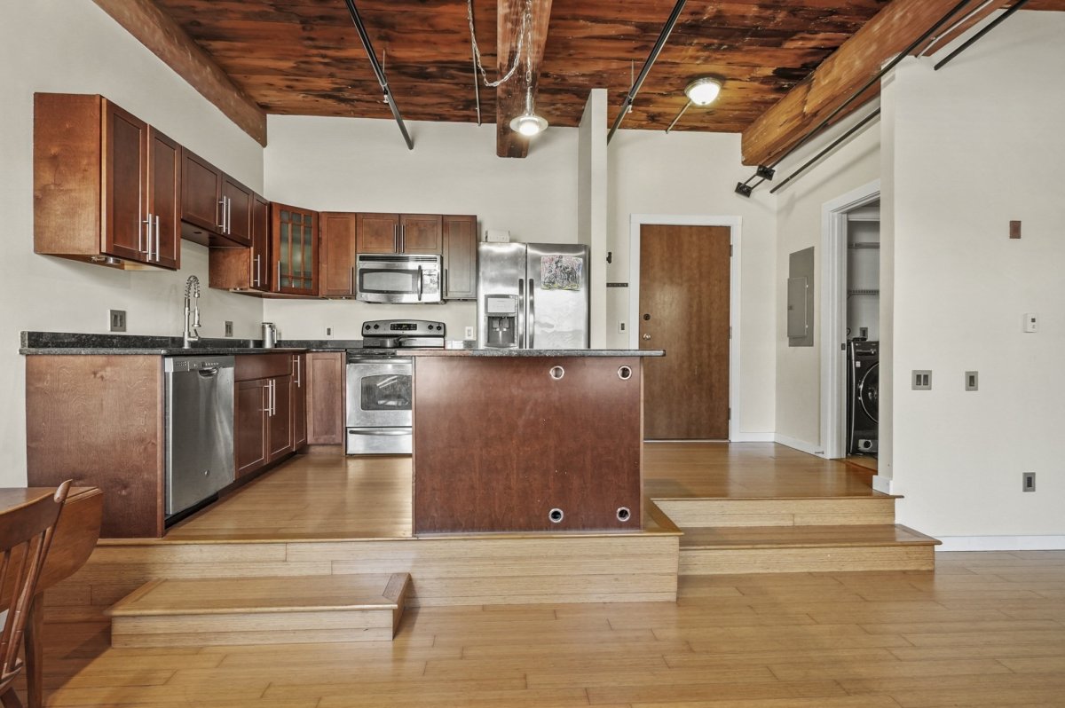 Welcome to Kettle Brook Lofts! This fourth-floor industrial-style condo combines character and comfort with an open-concept living area filled with natural light, exposed brickwork, and hardwood floors throughout. The spacious living room with fireplace and dining area opens to a sleek kitchen with stainless steel appliances, while the bedroom offers plenty of closet space and a full bath nearby. Enjoy the convenience of central air and in-unit laundry with a washer/dryer combo. Take in the beautiful views of the Kettle Brook trailhead, with a reserved parking spot and ample guest parking. Don’t miss your chance to call this stunning loft home!
